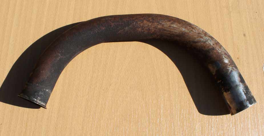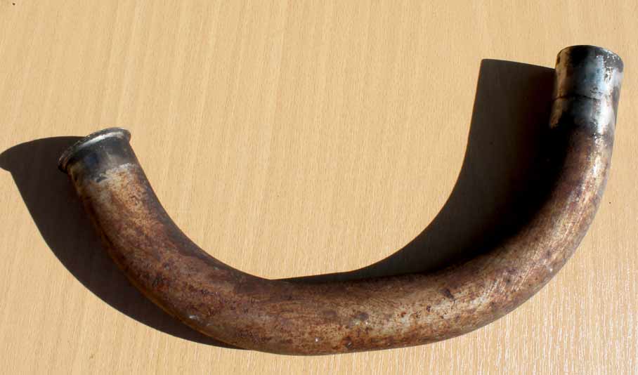 Koleno výfuku na JAWA 90. Nálezový stav dle obrázků, určeno na renovaci. Průměr trubky vnější 36mm, u motoru s osazením 40mm – měřeno obyčejným metrem.