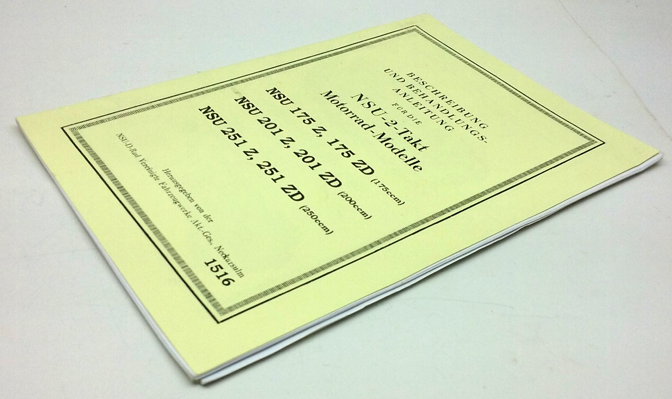 NSU 175 Z, 175 ZD, 201 Z, 201 ZD, 250 Z Návod obsluhy a údržby v němčině reprint. NSU -2-TAKT- NSU 175Z,175ZD, NSU 201Z, NSU 201ZD, NSU 251Z, NSU 251ZD – Beschreibung und behandlungs – anleitung, 23 stránek textu formát A5