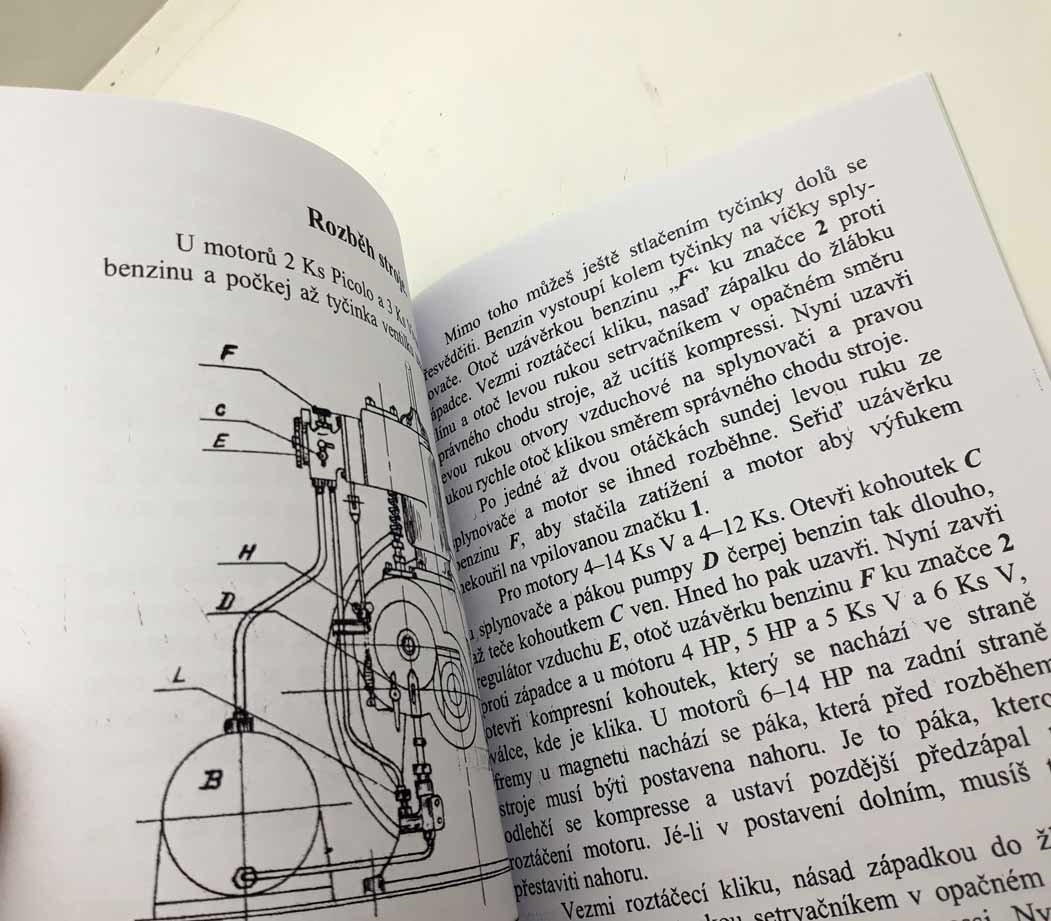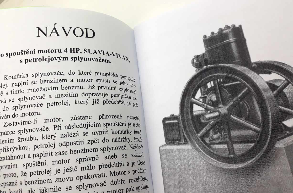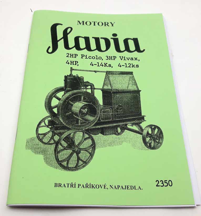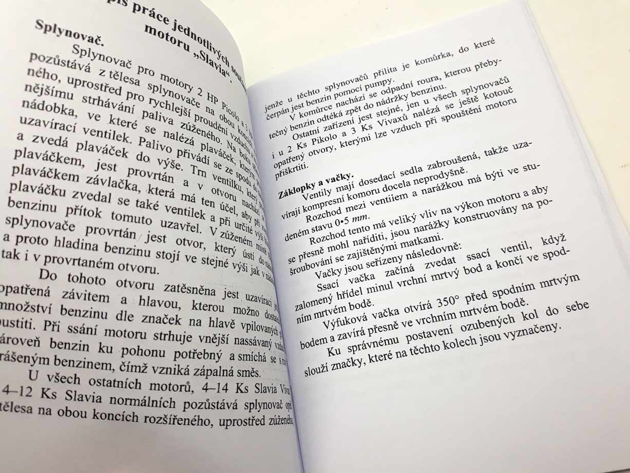 Slavia stabilní motory – Návod k obsluze, údržbě a seřízení – reprint. Popisovány jsou zážehové motory 2HP Picolo, 3HP Vivax, 4HP, 4-14Ks a 4-12ks