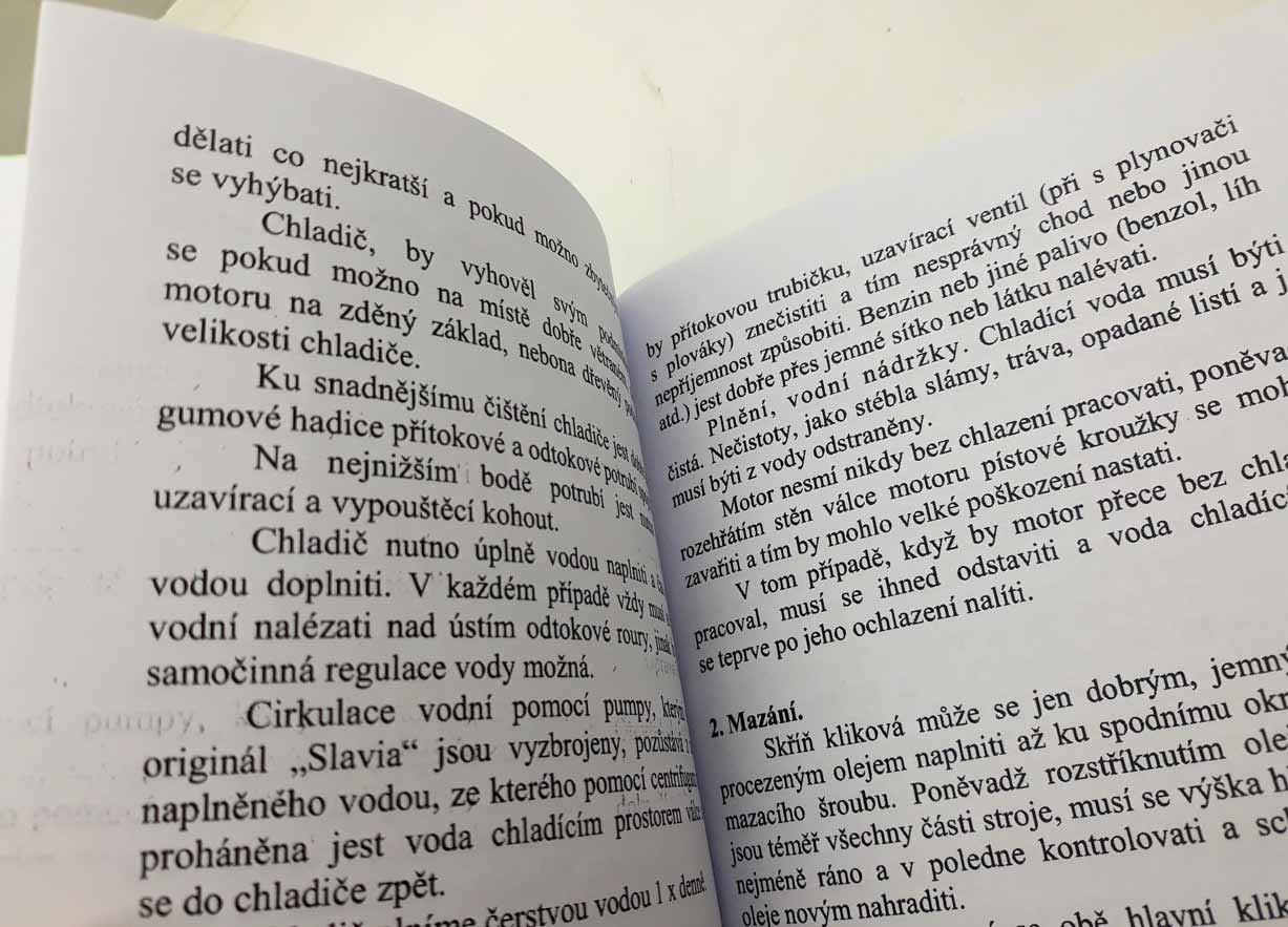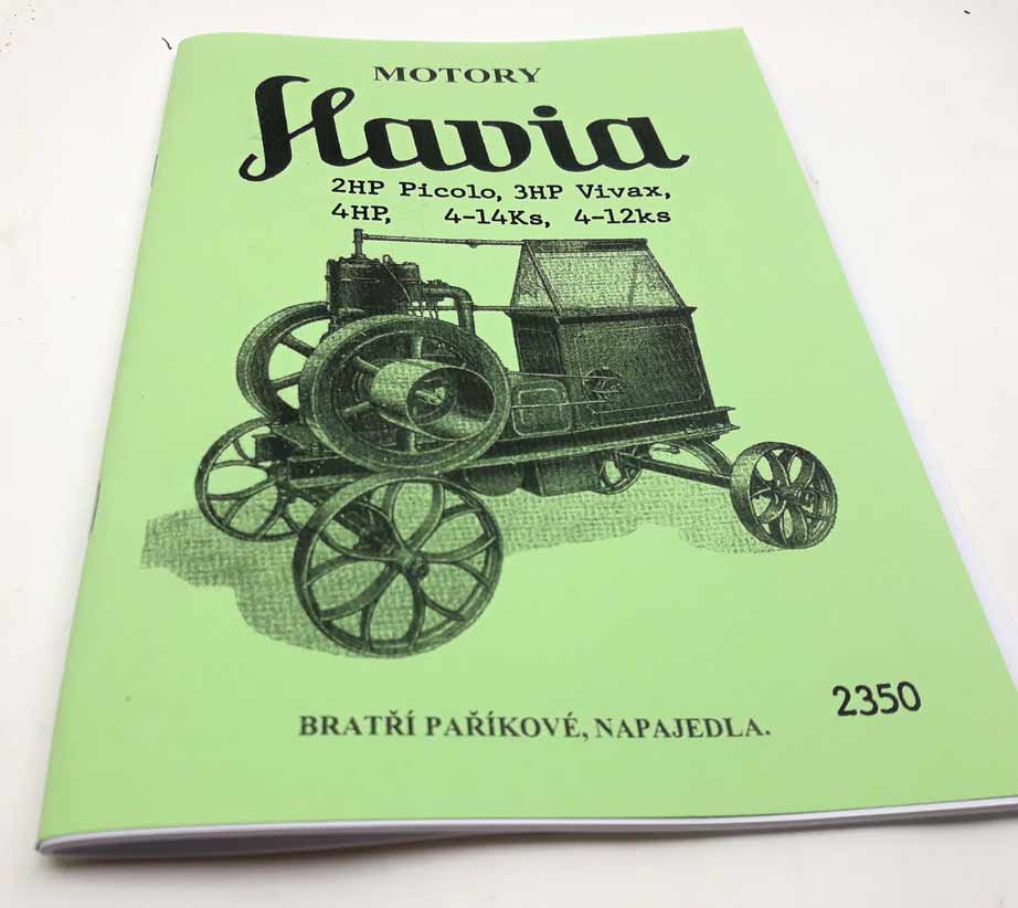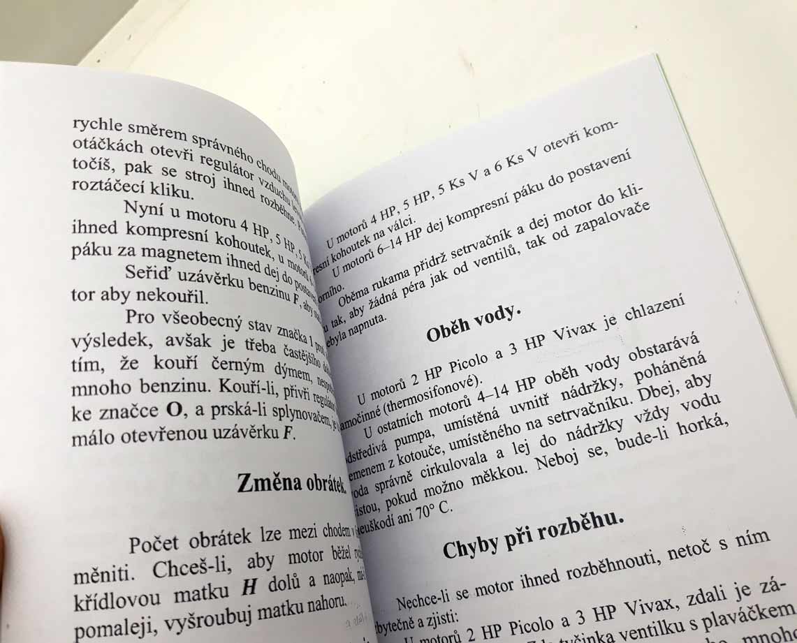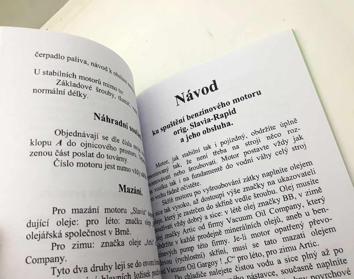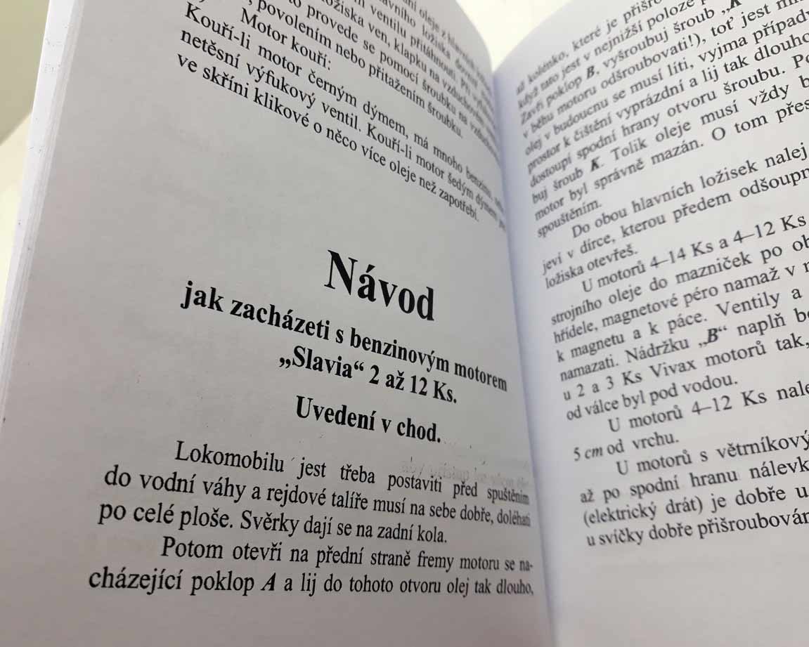 Slavia stabilní motory – Návod k obsluze, údržbě a seřízení – reprint. Popisovány jsou zážehové motory 2HP Picolo, 3HP Vivax, 4HP, 4-14Ks a 4-12ks