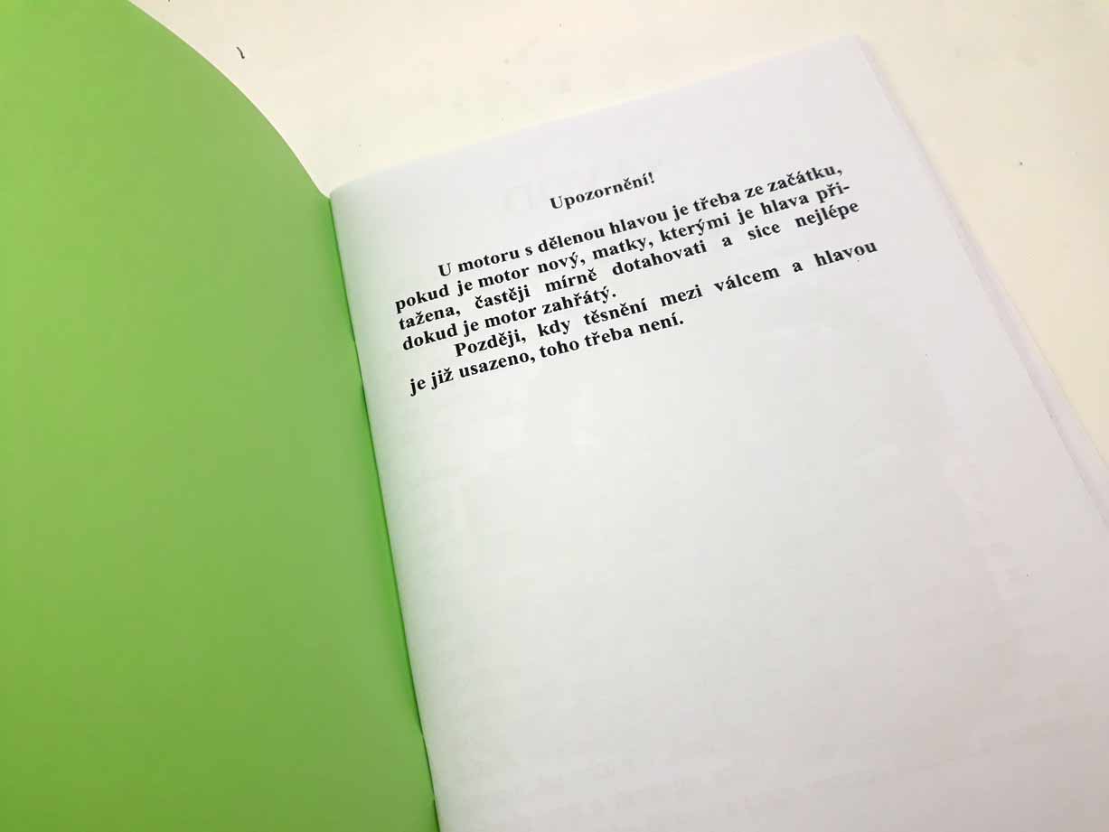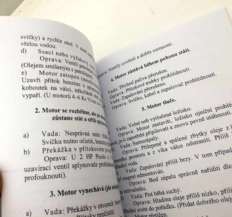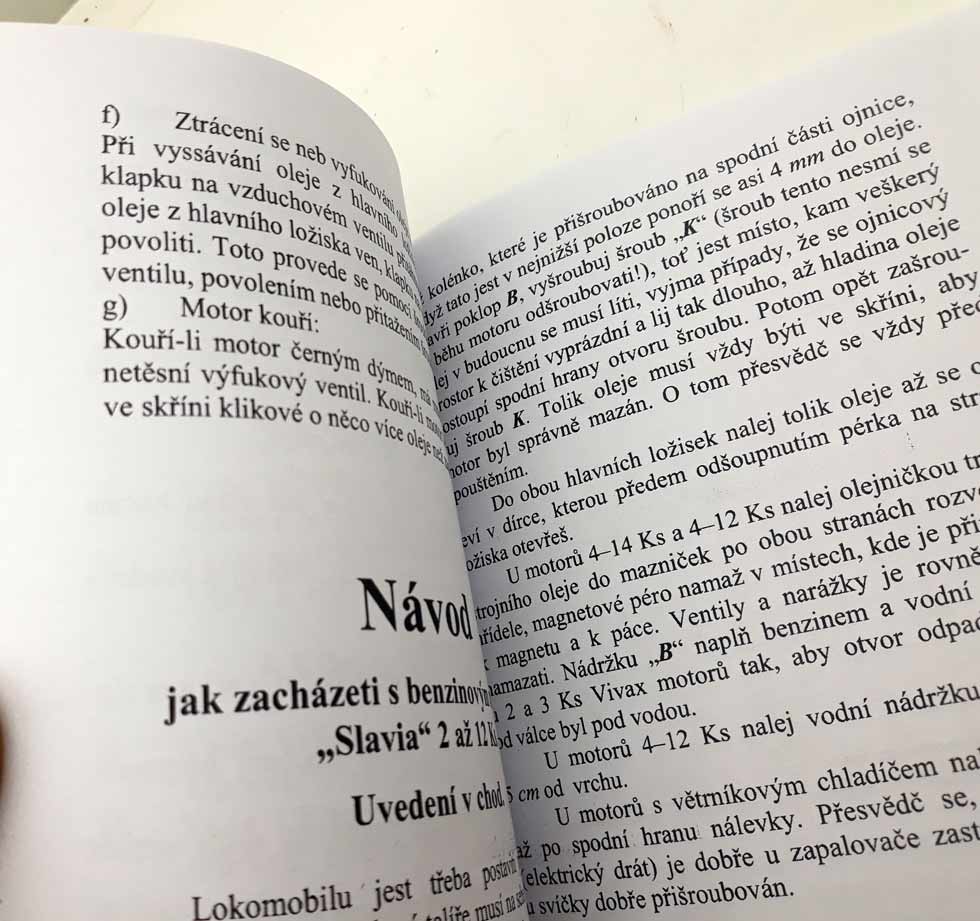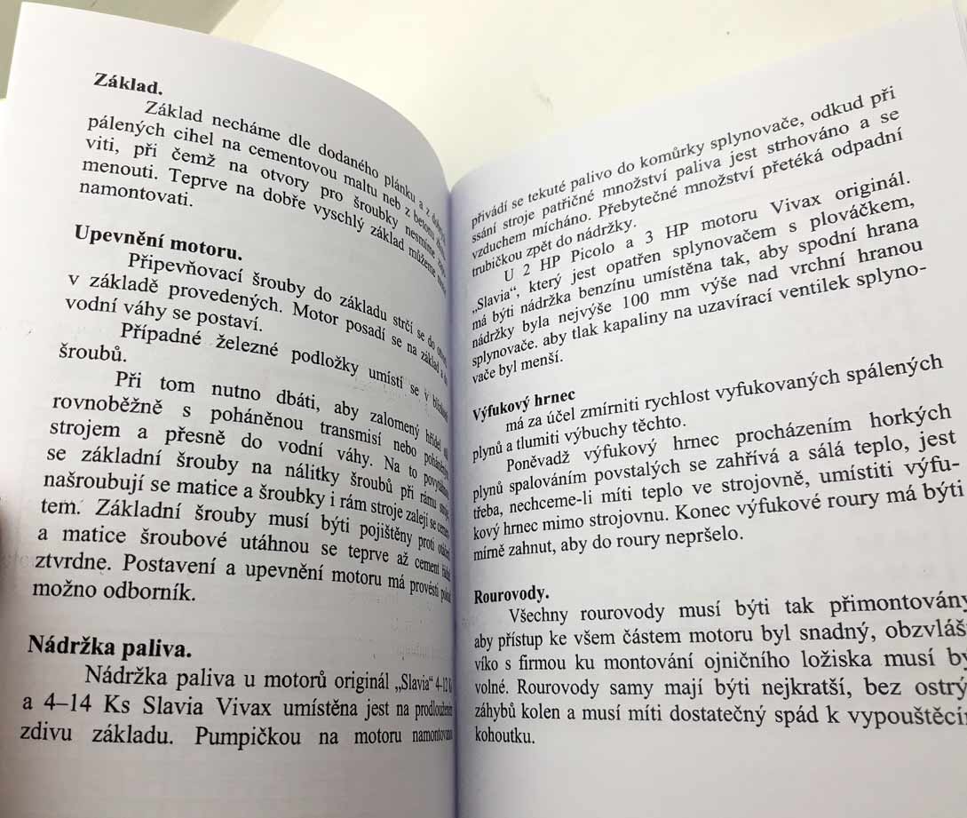 Slavia stabilní motory – Návod k obsluze, údržbě a seřízení – reprint. Popisovány jsou zážehové motory 2HP Picolo, 3HP Vivax, 4HP, 4-14Ks a 4-12ks