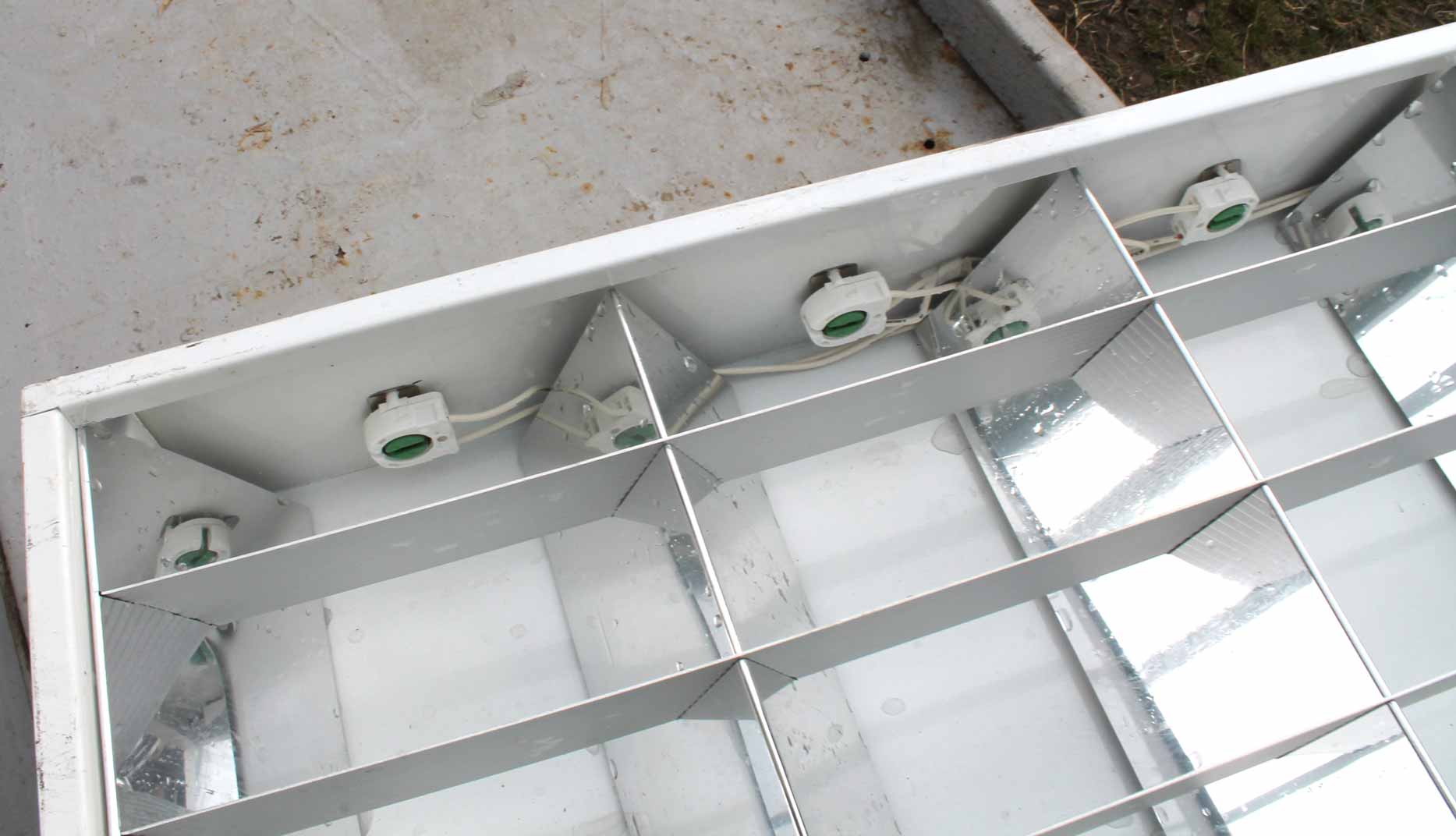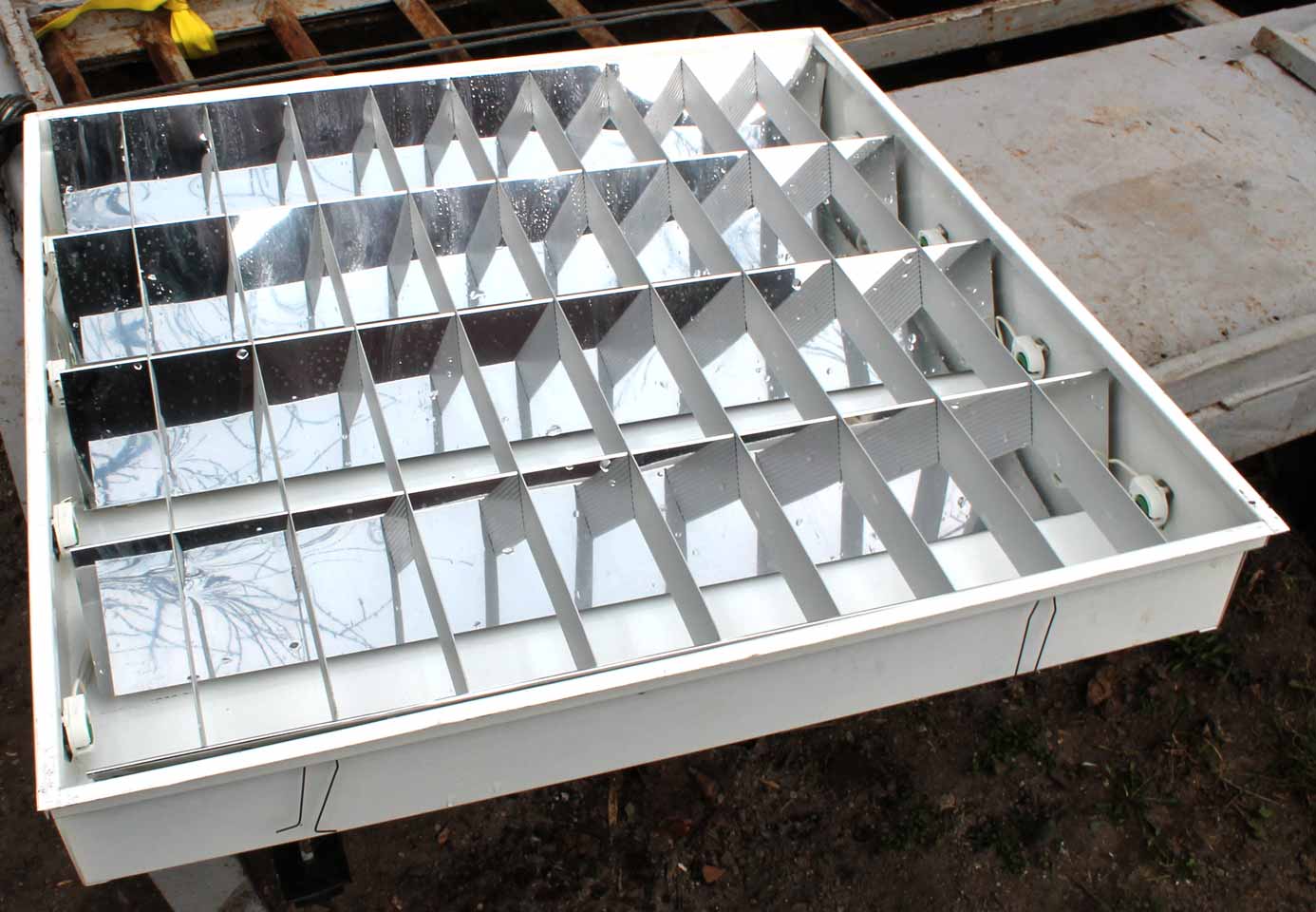 Stropní 4 zářivkové svítidlo do podhledu. Svítidlo k zabudování do podhledu, použité, bez trubic, velikost 62x62cm, 60x60cm pro vyříznutí otvoru. Stav a kompletnost podle obrázků, bez záruky.