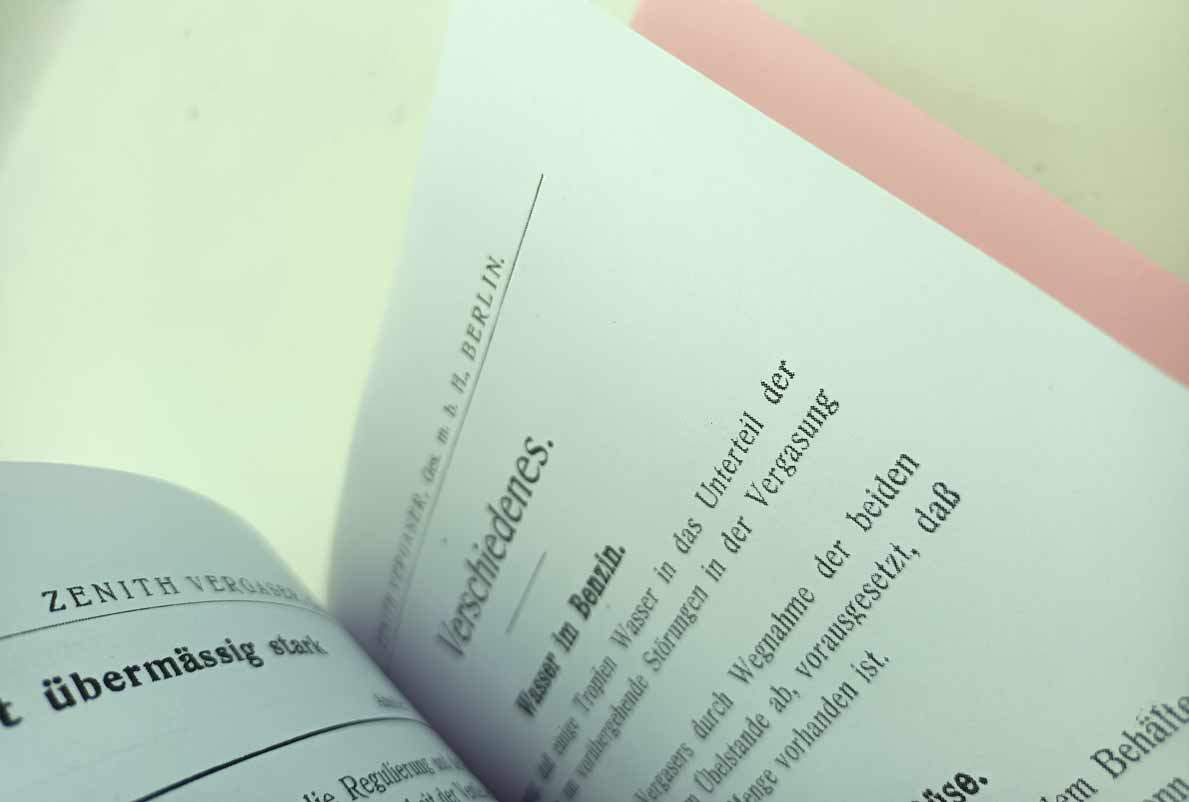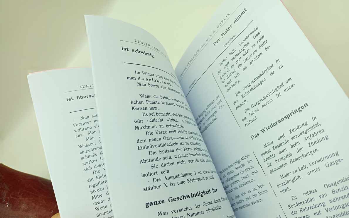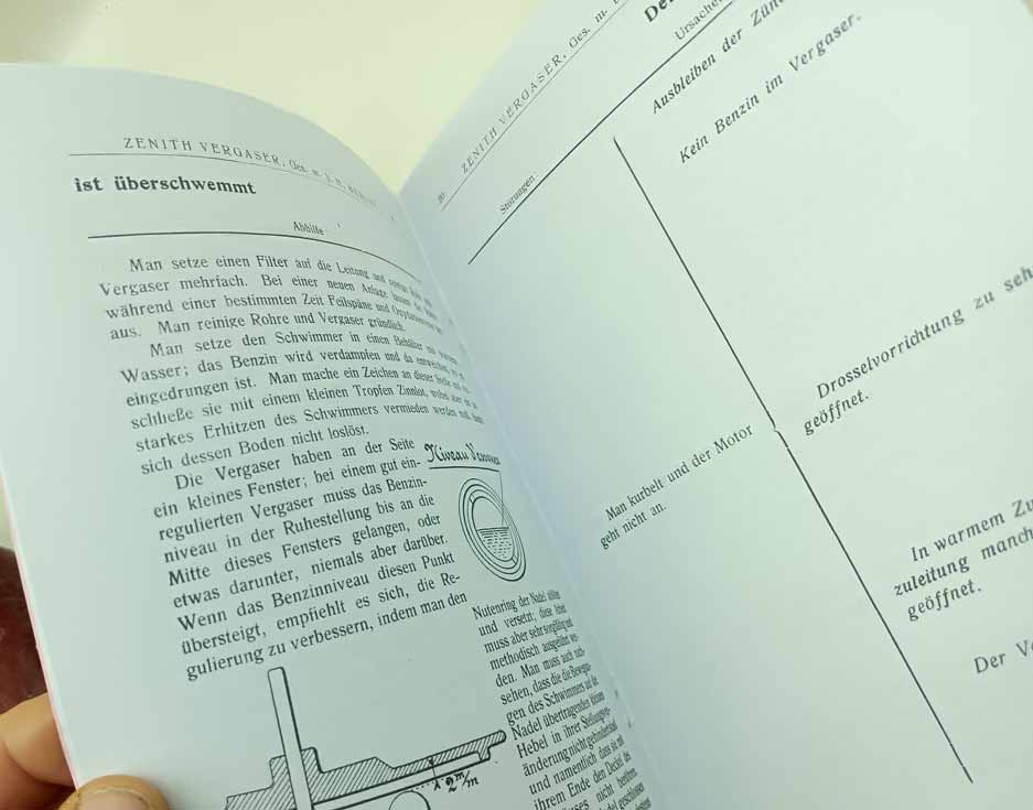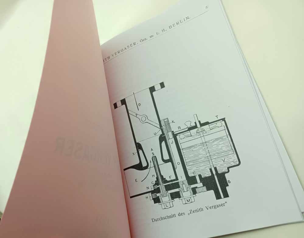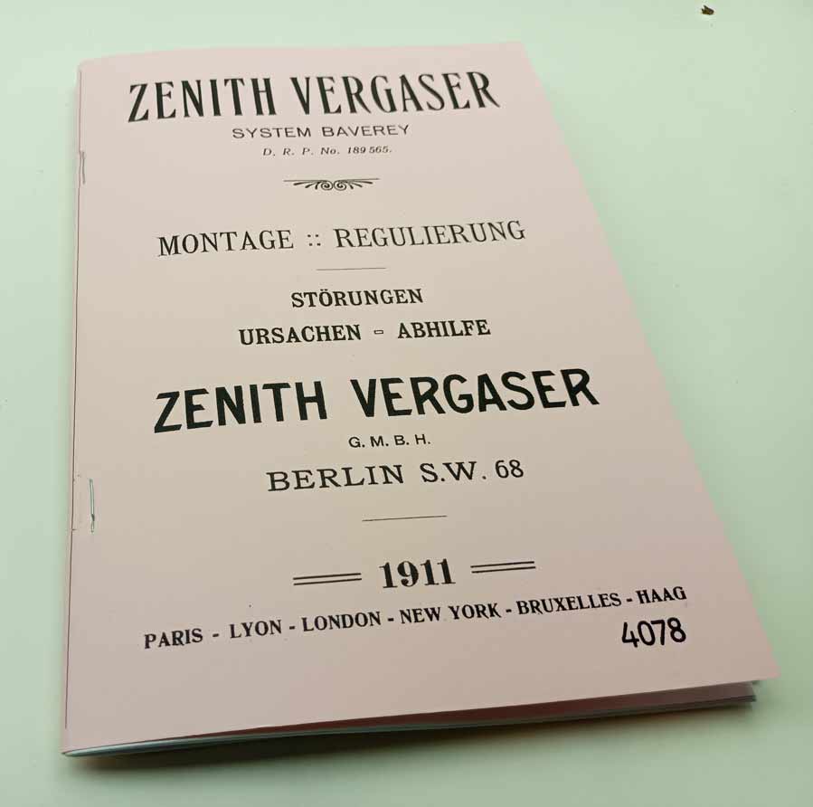 Zenith Vergaser – systém Baverey reprint. Montáž nastavení v němčině – karburátor z roku 1911