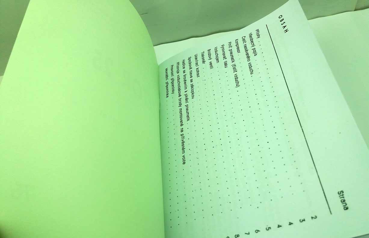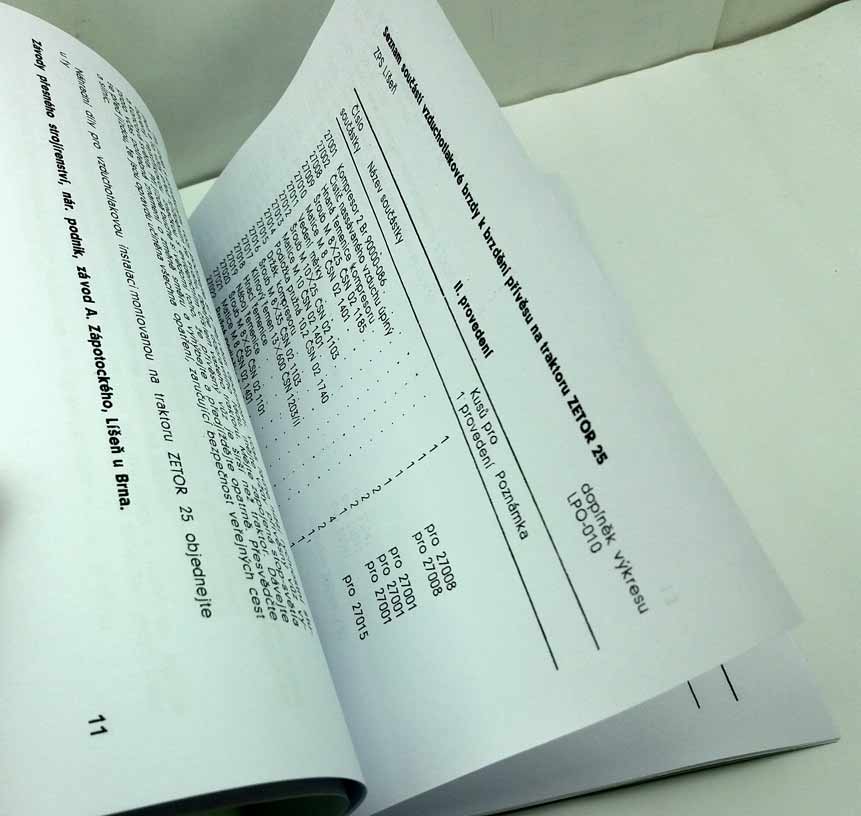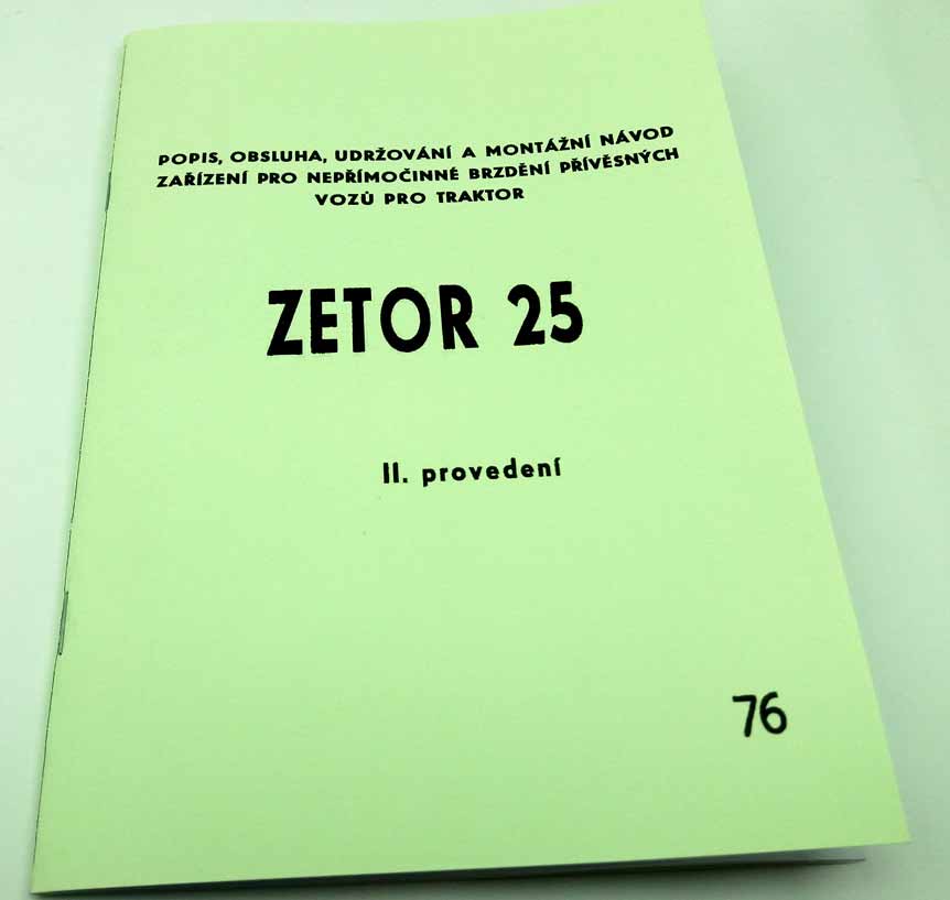 Zetor 25 – Popis, obsluha, udržování a montážní návod zařízení pro nepřímočinné brzdění přívěsných vozů pro traktor – reprint – Vytištěno podélně na A5, takže pro čtení je potřeba stránku otočit o 90 stupňů – viz ukázka.